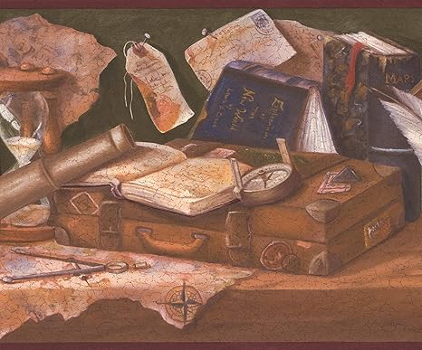 Amazon Retro Art 中世のワークベンチ グローブインクウェル付きフェザー地図ブックスコンパス砂時計緑茶壁紙ボーダーレトロなデザイン ロール15 X 10 25 壁紙