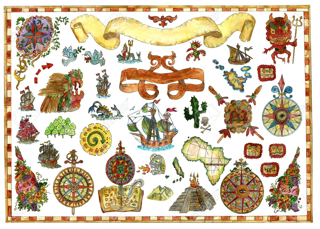 カラフルなデザインは 船 コンパス バナー 宝の島 海洋のシンボルと水彩画セットします 古代 中世の海賊マップ ビンテージの冒険 古い交通機関のコレクション の写真素材 画像素材 Image 65660878